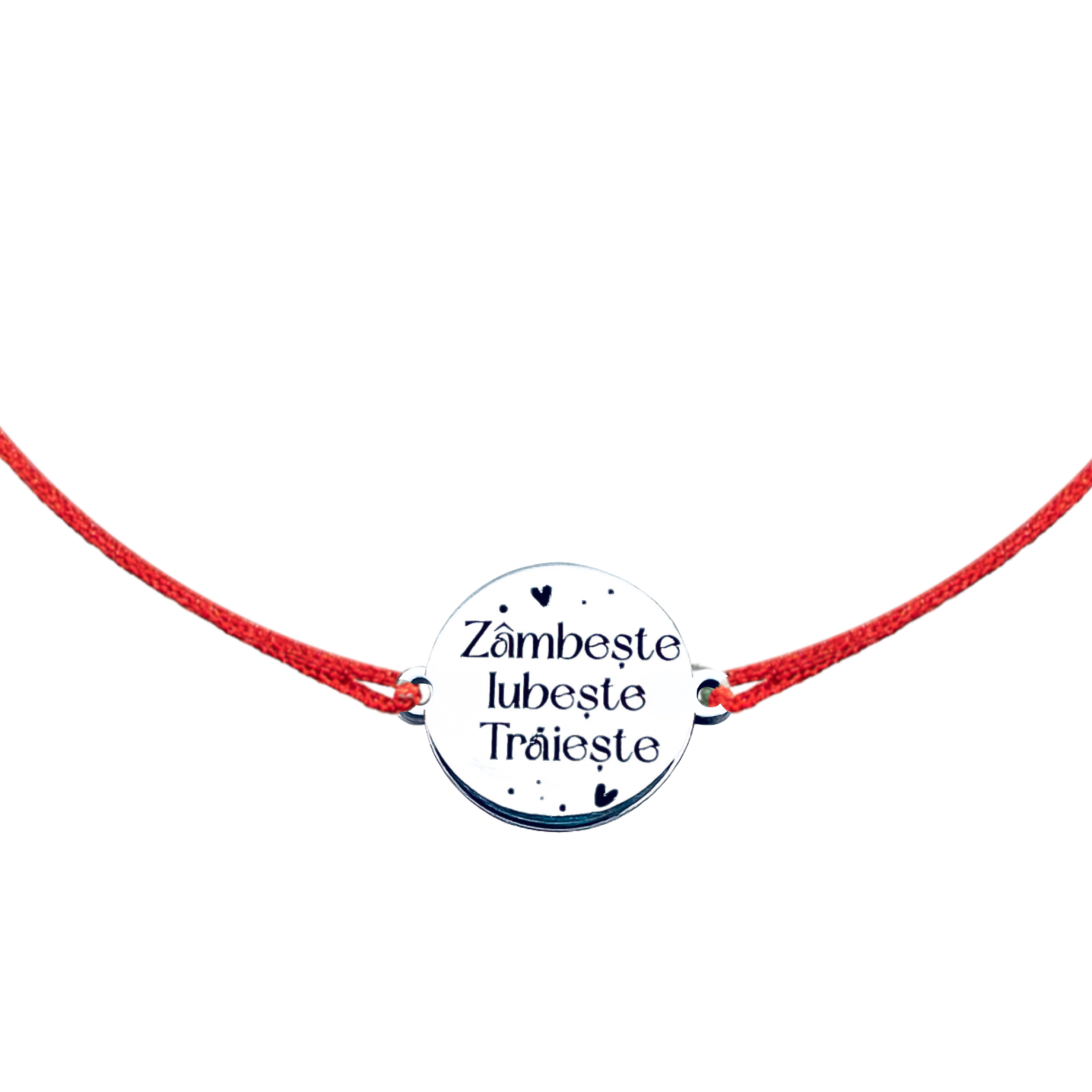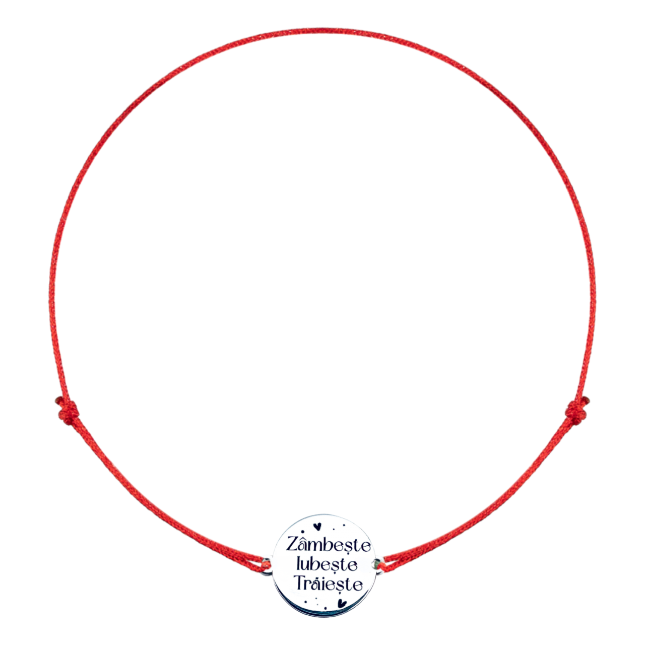 Bratara personalizata are un banut de 11 mm din argint si un snur reglabil textil, de foarte buna calitate, in culoare la alegere.
