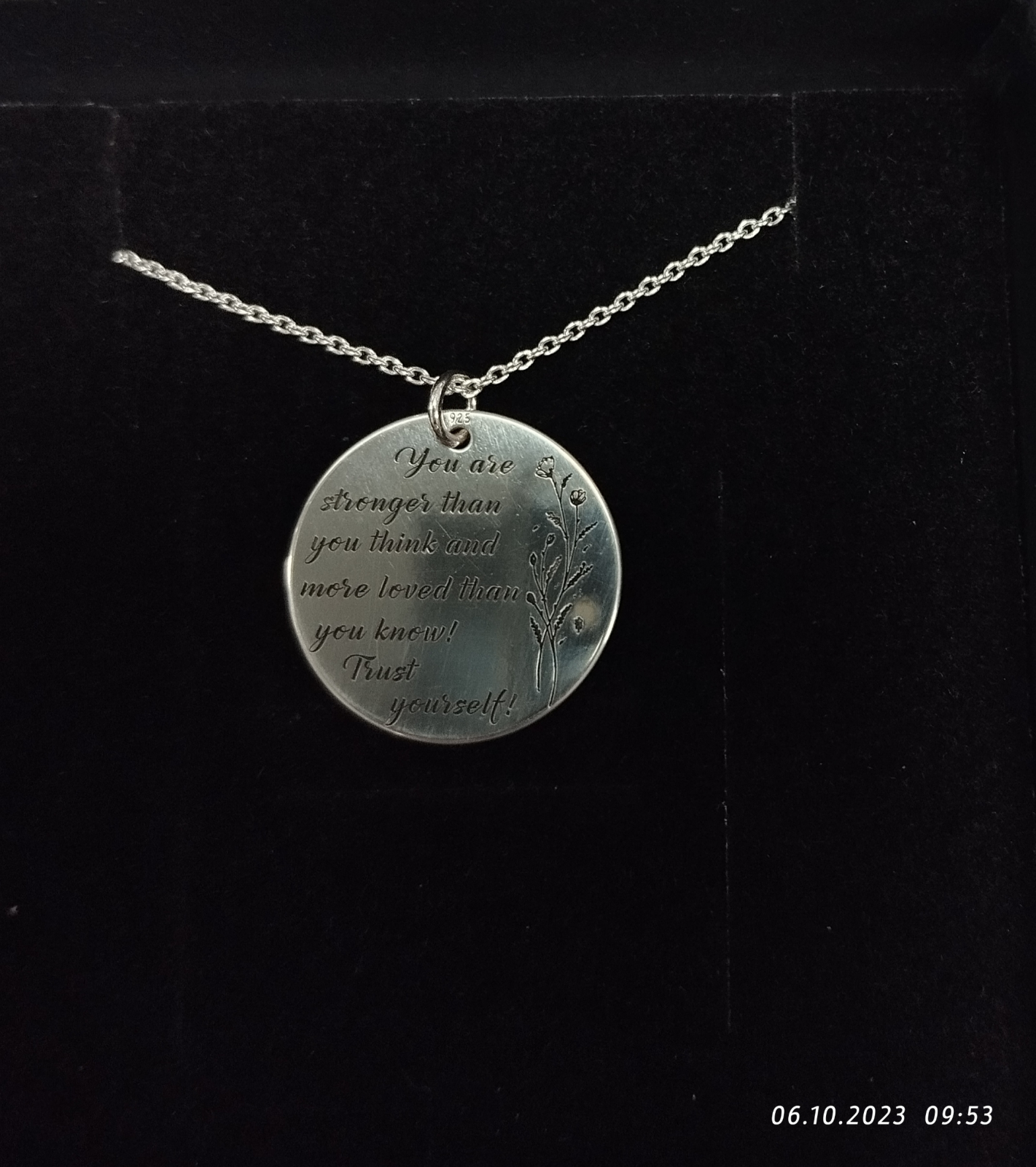 Modelul pe care ti-l propunem este alcatuit dintr-un pandantiv de 19x19mm si lant cu bile de 50cm sau 55cm, din argint 925, pe care putem inscriptiona orice mesaj.