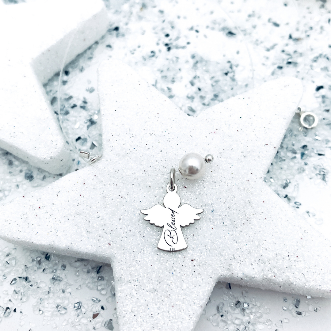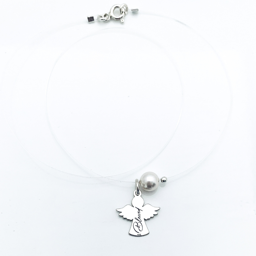 Colierul este compus dintr-un fir transparent, o perlă Swarovski în culoarea aleasă, un pandantiv din argint în formă de îngeraș și o biluță tot din argint. Pentru un plus de personalitate, se poate adăuga o extensie cu tag din argint 925. Sistemul de închidere este realizat integral din argint, pentru durabilitate și un aspect elegant.