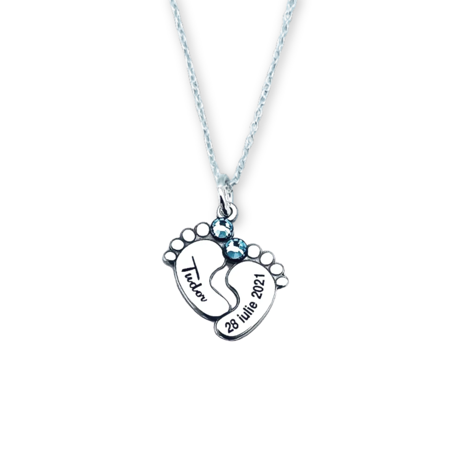 Caracteristici colier din argint personalizat cu talpite bebe – nume si data