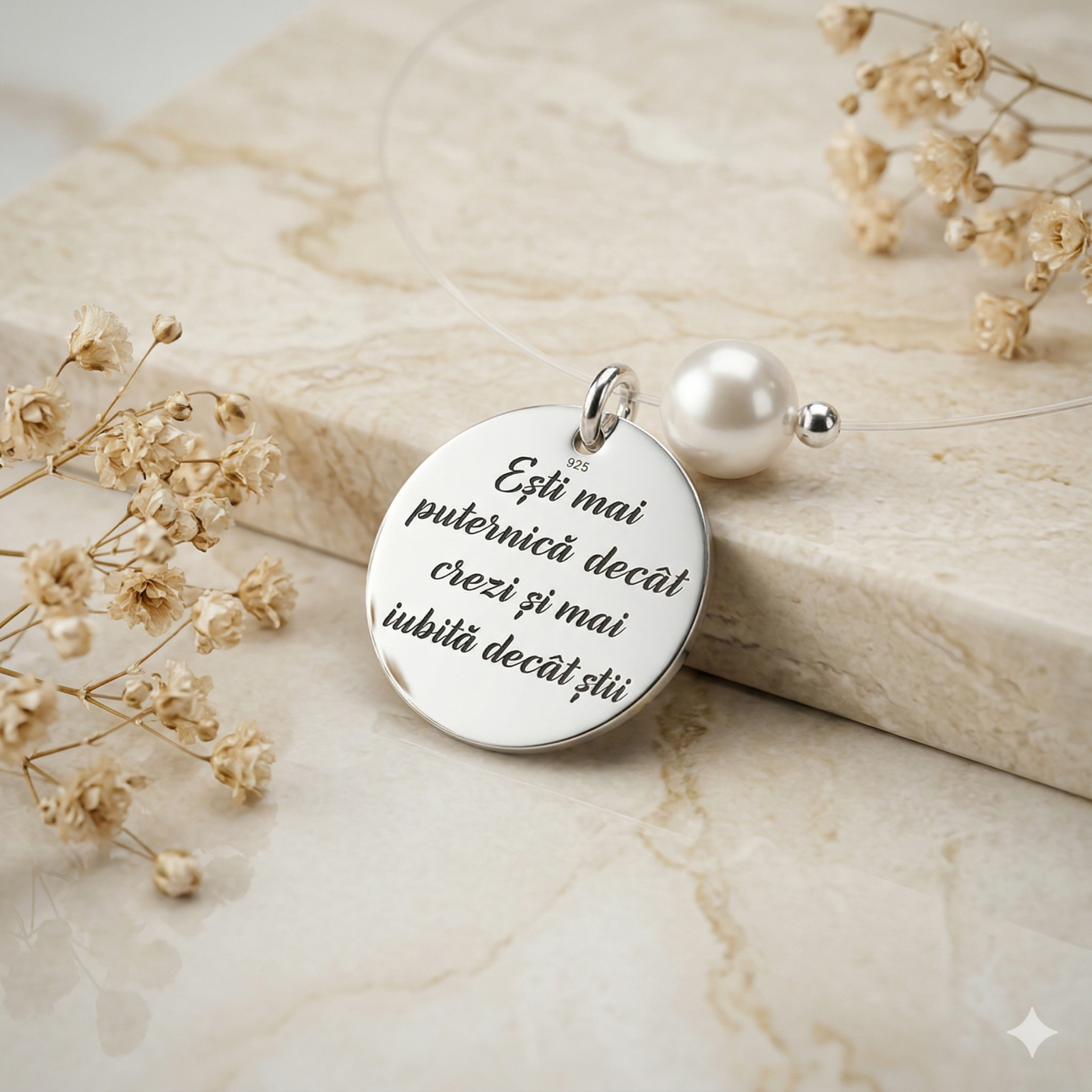 Lantisorul cu fir transparent cu perla si pandantiv din argint este alcatuit dintr-un colier cu fir transparent, o perla Swarovski, un banut din argint de 17mm si o biluta din argint. La acest colier se poate atasa si o extensie cu tag din argint 925. Inchizatorile sunt, de asemenea, din argint.
