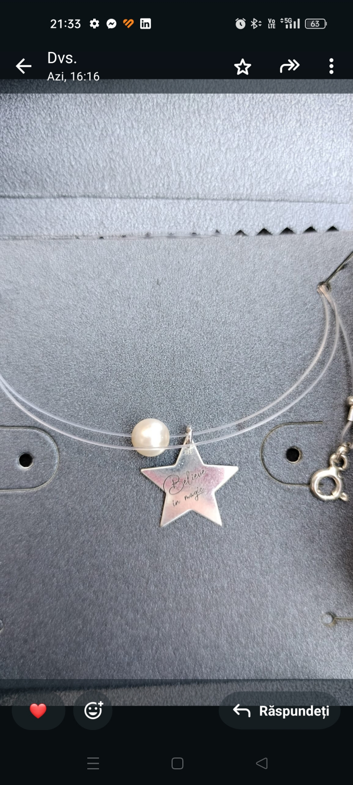 Lantisorul din silicon cu perla swarovski si pandantiv din argint este alcatuit dintr-un colier cu fir transparent, o perla Swarovski, o steluta din argint de 15mm si o biluta tot din argint. La acest colier se poate atasa si o extensie cu tag din argint 925. Inchizatorile sunt, de asemenea, din argint.