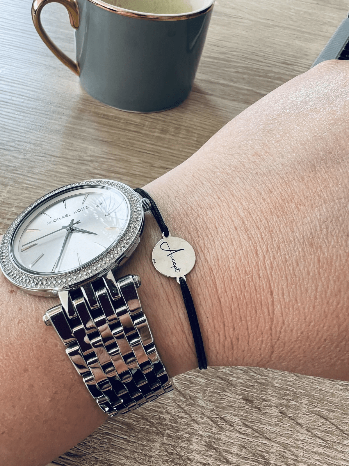 Am ales sa port la incheietura mainii, martor discret al fiecarei clipe si al fiecarui puls, cuvantul “Accept”. Este un reminder permanent de a accepta momentul prezent asa cum este, fara a incerca sa-l schimb. Iubesc delicatetea si discretia bratarii, de multe ori se ascunde sub ceas, este un talisman doar pentru mine.