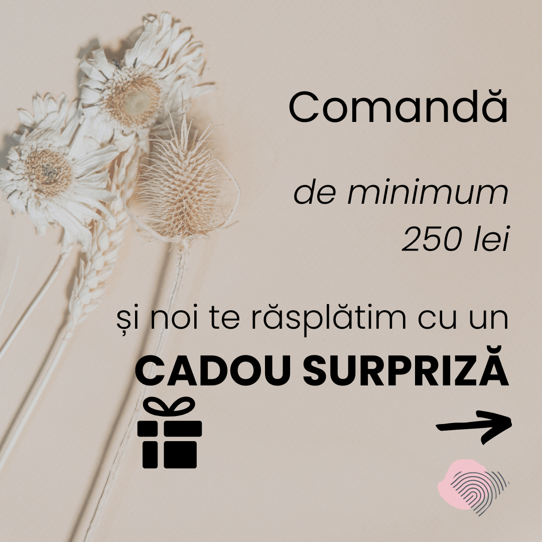 La fiecare comandă peste 200 lei, adăugăm în pachet un Cadou Surpriză: mic, special și ales să-ți aducă un zâmbet.